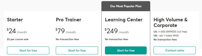 - The Starter plan is super affordable (at first). You’ll pay just $24 per month with annual billing. You’ll also pay $5 for every course sold, so it won’t be optimal for long, but it’s great for beginners.